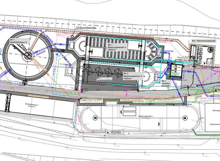 - BA 2: Neubau Belebungsbecken, Nachklärbecken (Rundbecken), Ablaufmessung, Maschinengebäude, Sozialgebäude, Dosierstation, Biofilter