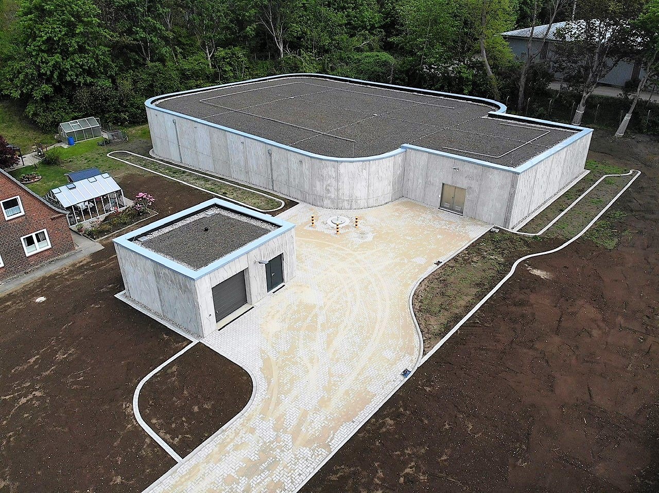 Die Stadtwerke Kiel AG betreiben vier Wasserwerke, die insgesamt über 82.000 Haushalte mit Trinkwasser versorgen. Um die Wasserversorgung der Stadt Preetz auch in Zukunft zu gewährleisten, wird an dem Standort des alten Wasserwerkes Preetz ein neuer Trinkwasserbehälter aus Beton mit einem Speichervolumen von 3.200 m³, aufgeteilt auf zwei Wasserkammern, errichtet. An den Trinkwasserbehälter wird eine zweigeschossige Schieberkammer angeschlossen, in der neben der erforderlichen Verrohrung eine Druckerhöhungsanlage aufgestellt wird. Gebaut wird der gedämmte Behälter als Stahlbeton-Fertigteilkonstruktion, um die höchst mögliche Qualität des Betons zu gewährleisten. So sind alle Wände, Stützen, Unterzüge und Deckenelemente im Werk hergestellt. Die Herstellung der Sohlen und der Deckenoberflächen erfolgt in Ortbeton mit erhöhten Anforderungen. Das äußere Erscheinungsbild prägen eine strukturierte und begrünte Fassade und eine extensive Dachbegrünung zur harmonischen Eingliederung in das Stadtbild. Durch diese Maßnahmen wird als weiterer positiver Effekt eine insektenfreundliche Umwelt geschaffen.