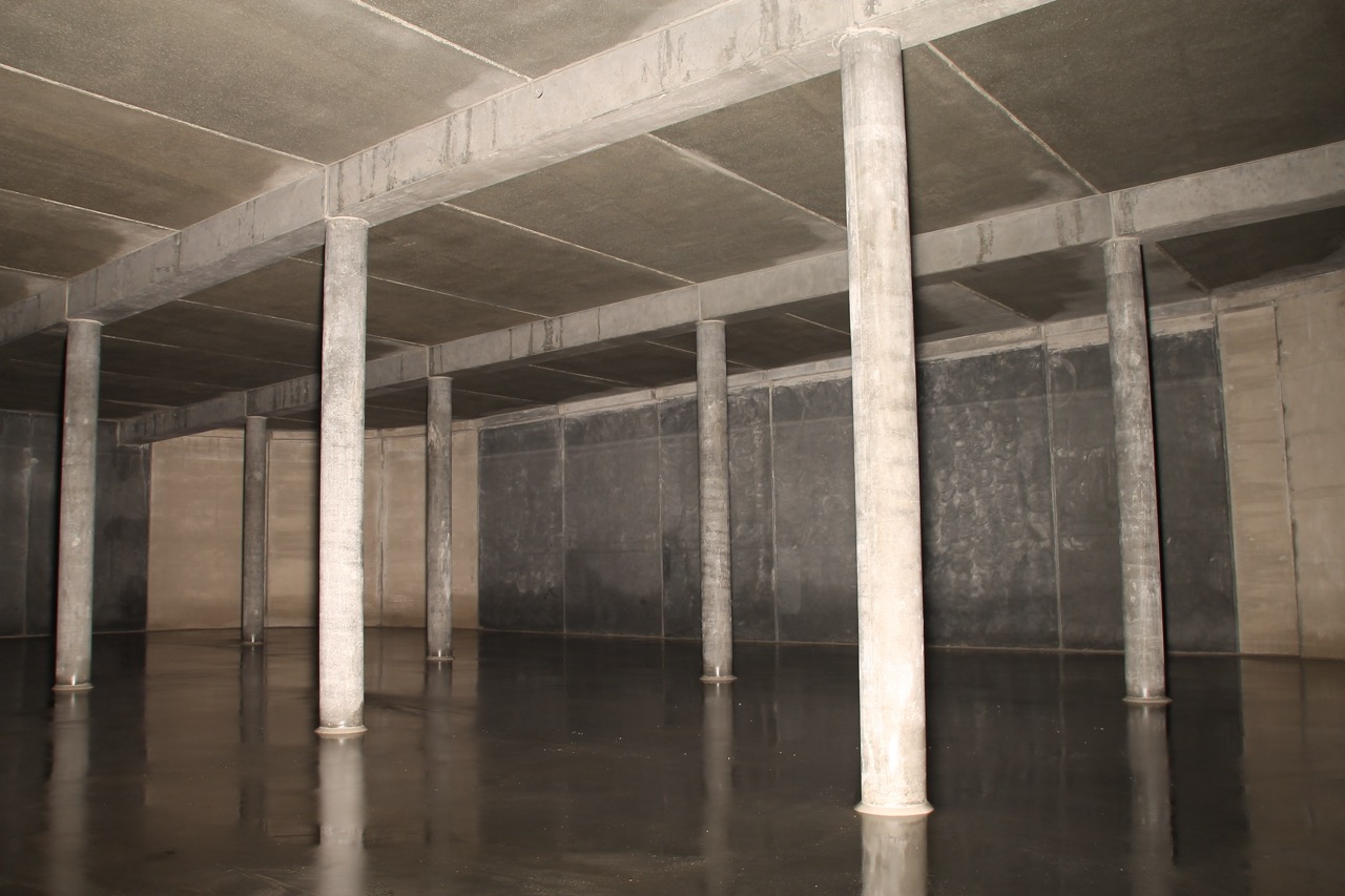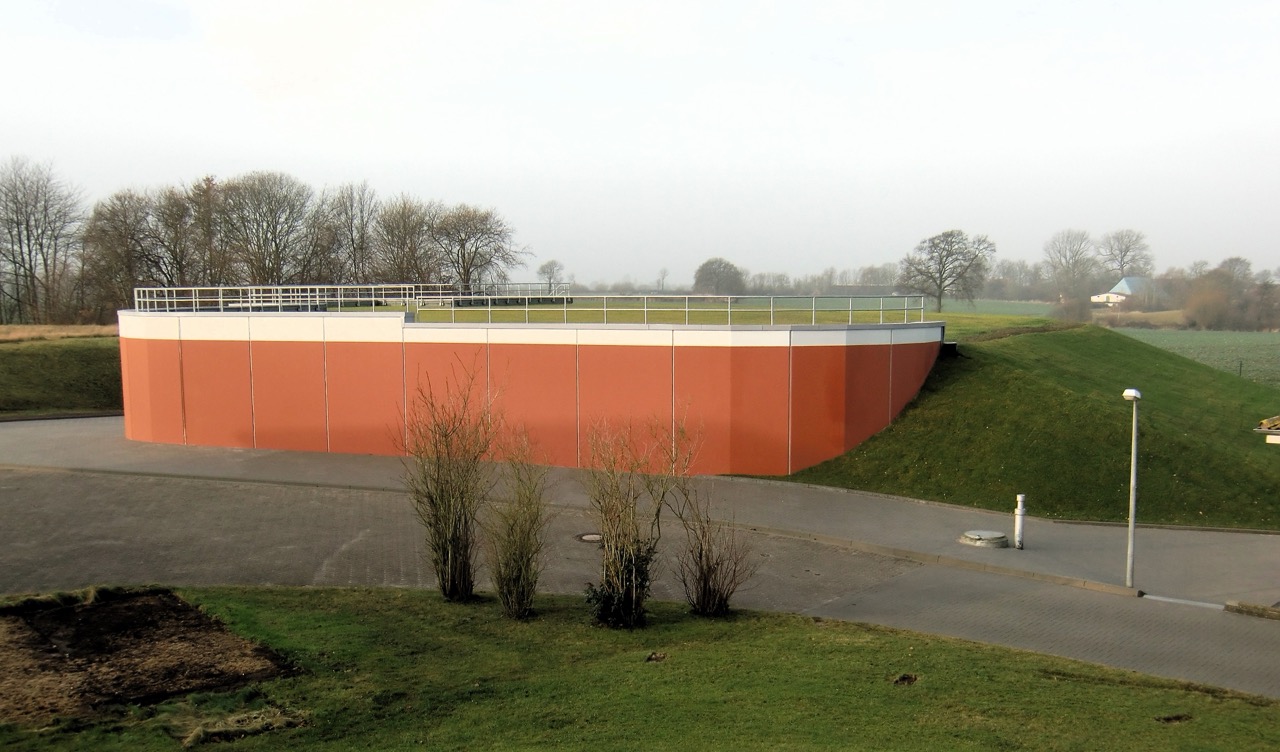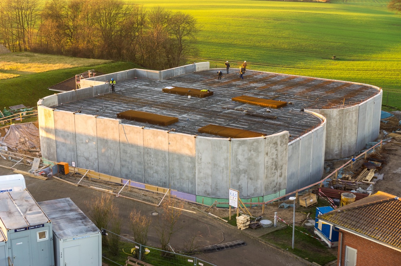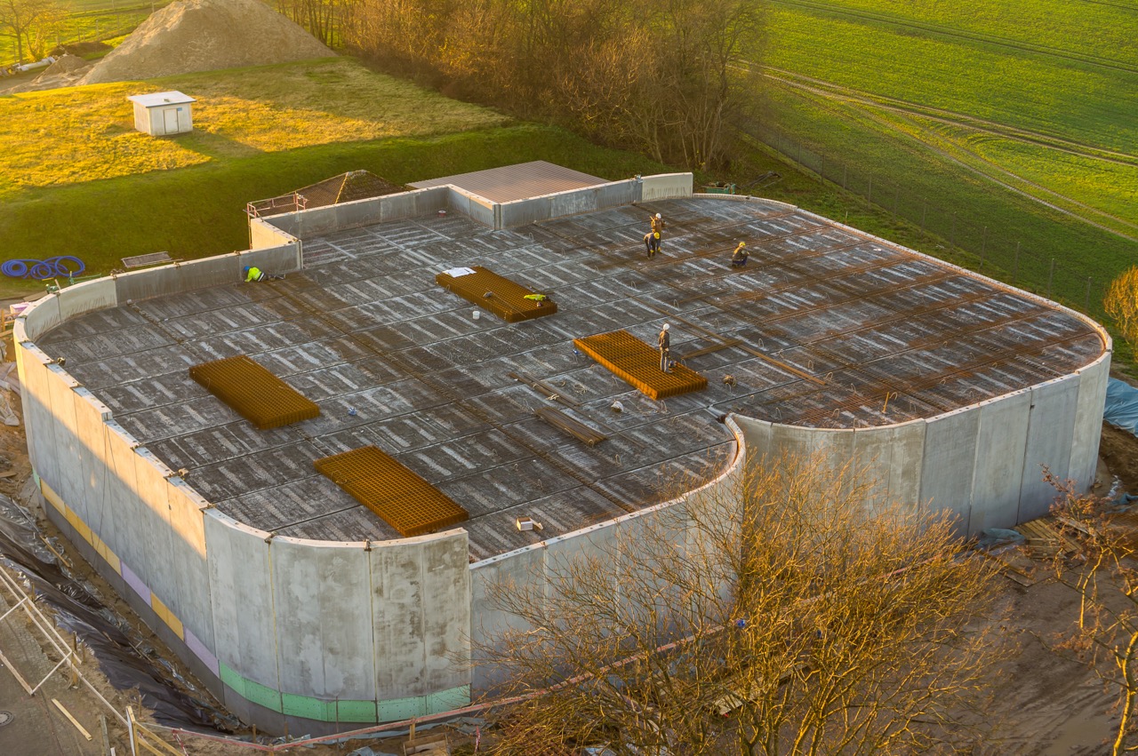 2.000 m³ mit einer dazwischen angeordneten Schieberkammer vorhanden. Im Vorfeld der Neubaumaßnahme wurde einer dieser beiden erdüberdeckten Trinkwasserbehälter zurückgebaut. Als Ersatz wird an dem Standort des abgebrochenen Behälters ein neuer Wasserbehälter mit einem Volumen von 4.000 m³, aufgeteilt auf zwei Wasserkammern, aus Fertigteilen als Spannbetonbehälter gebaut und an die bestehende Schieberkammer angeschlossen. Nach der Fertigstellung des neuen Behälters wird auch der zweite alte Behälter außer Betrieb genommen. An zwei Seiten ist der neue Behälter als erdüberdecktes Bauwerk konzipiert, an den beiden anderen Seiten muss aus Platzgründen auf eine Anböschung verzichtet werden, hier wird eine gedämmte Vorsatzschale aus Betonfertigteilen angeordnet.